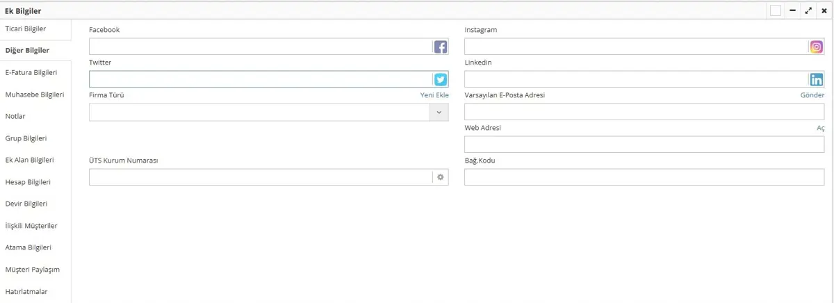 Facebook/Instagram/Twitter/Linkedn: Firmaya ait tüm sosyal medya hesap bilgilerini girebileceğiniz alandır. Facebook, Instagram, Twitter (X), LinkedIn platformlarına ait hesap bağlantılarını bu alana ekleyebilirsiniz.